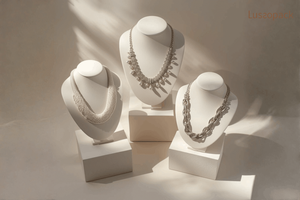 When considering how to display necklaces for sale, use busts or T bars of varying heights. This prevents chains from tangling and allows the pendant to catch the light at the correct angle. Layering necklaces on a single bust can also show customers how to style multiple pieces together, which often leads to multi-item sales.